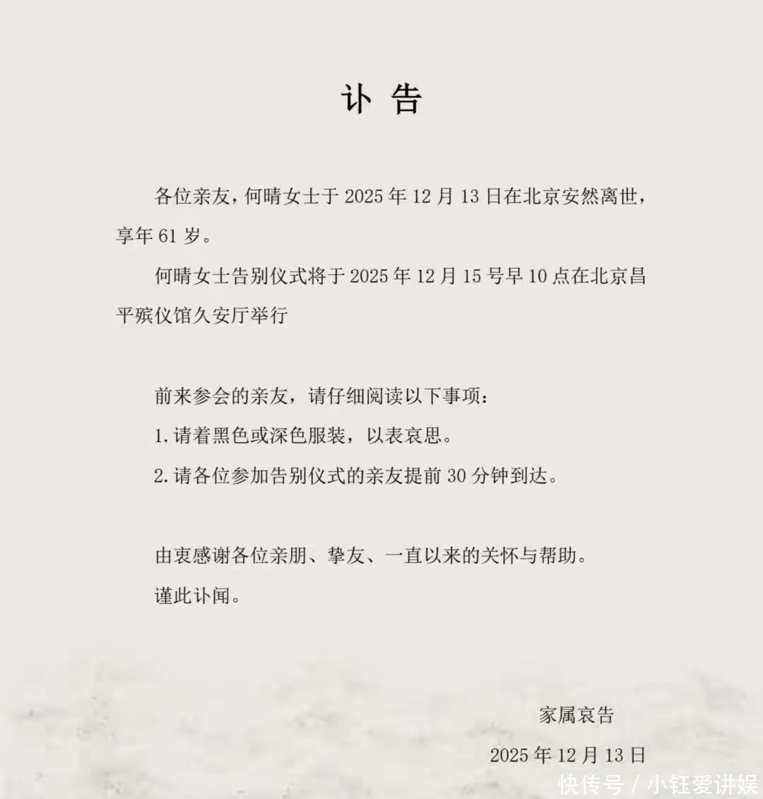 家属在昨天发布了讣告,何晴的告别仪式将于12月15日10点在北京昌平殡仪馆举行。在讣告中,家属还说明了两点要求,第一,请前来参会的亲友穿黑色或深色服装,第二,要求亲友在告别仪式前30分钟到达告别厅。